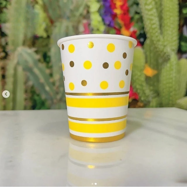 10 darabos kartonpohár készlet, tarka pöttyökkel és csíkokkal díszítve - ideális születésnapokra, tematikus partikra, babaváró bulikra vagy nemi identitás felfedésére.