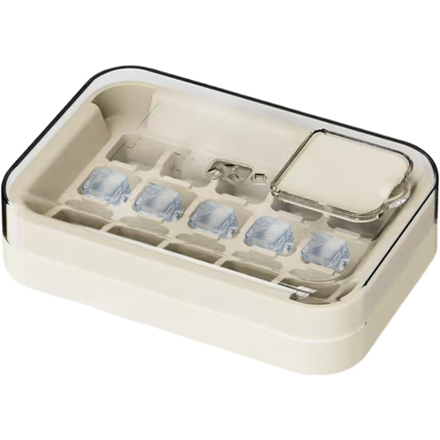 Jégkockatartó, 15 kocka, visszanyomó rendszerrel, töltő- és leeresztő fedéllel, 1 l, PET + TPU + PP, 16,5 x 11,2 x 4,5 cm