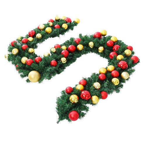 A girland PVC-ből készült és 270 centiméter hosszú. A girland zöld levelekből áll, és arany és piros karácsonyi golyókkal díszítették.