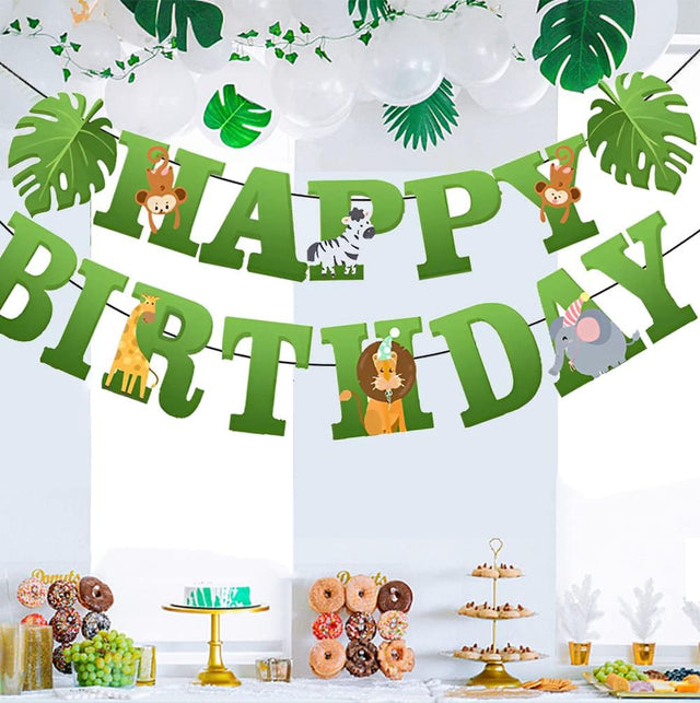 Design tematic: Elemente specifice junglei – frunze verzi, animale sălbatice și text “Happy Birthday” vizibil