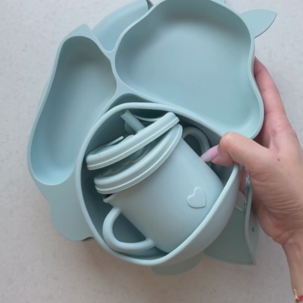 Setul include: Farfurie compartimentată cu ventuză, bol cu ventuză, tacâmuri din lemn și silicon, cană pentru gustări, bavoaie