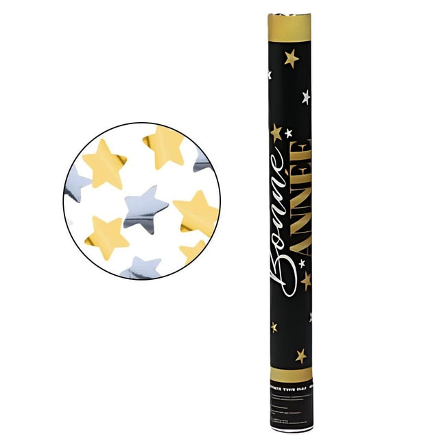 Sărbătorește intrarea în noul an cu stil! Tubul de Confetti – Bonne Année este accesoriul perfect pentru petrecerile de Revelion, adăugând un efect vizual spectaculos cu confetti în formă de steluțe aurii și argintii.